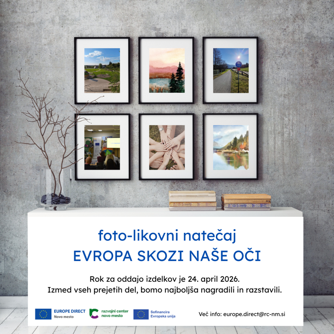 Informacijska točka EUROPE DIRECT Novo mesto, ki deluje pod okriljem Razvojnega centra Novo mesto, vas vabi k sodelovanju v fotografsko-likovnem natečaju Evropa skozi naše oči. Evropa ni le zemljevid, institucija ali oddaljena politična zgodba. Je del našega vsakdana: poti, po katerih hodimo, most, ki povezuje kraje in ljudi, priložnosti za učenje, delo in sodelovanje ter vrednote, ki jih živimo skupaj.