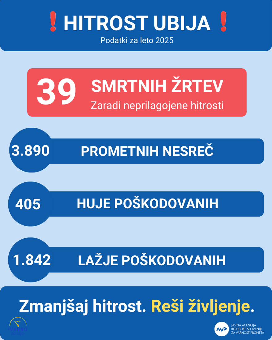 V letu 2025 se je zaradi neprilagojene hitrosti na slovenskih cestah zgodilo 3.890 prometnih nesreč, v katerih je umrlo 39 ljudi, 405 je bilo huje poškodovanih, 1.842 pa lažje. V letu 2024 pa je v 3.827 nesrečah zaradi hitrosti umrlo 30 ljudi, 411 se jih je huje poškodovalo, lažje pa 1.907. V prvih treh mesecih letošnjega leta (do 31. marca 2026) je bilo zaradi neprilagojene hitrosti zabeleženih 776 prometnih nesreč, v katerih je umrlo 9 udeležencev, 36 pa se jih je huje telesno poškodovalo. Število umrlih se je v letu 2025 v primerjavi z letom 2024 povečalo za 30 %, za dober odstotek in pol pa se je zmanjšalo število hudo telesno poškodovanih.