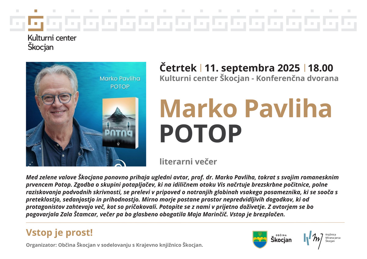 z velikim veseljem vas vabimo na literarni večer z uglednim avtorjem prof. dr. Markom Pavliho, ki bo predstavil svoj romaneskni prvenec Potop.