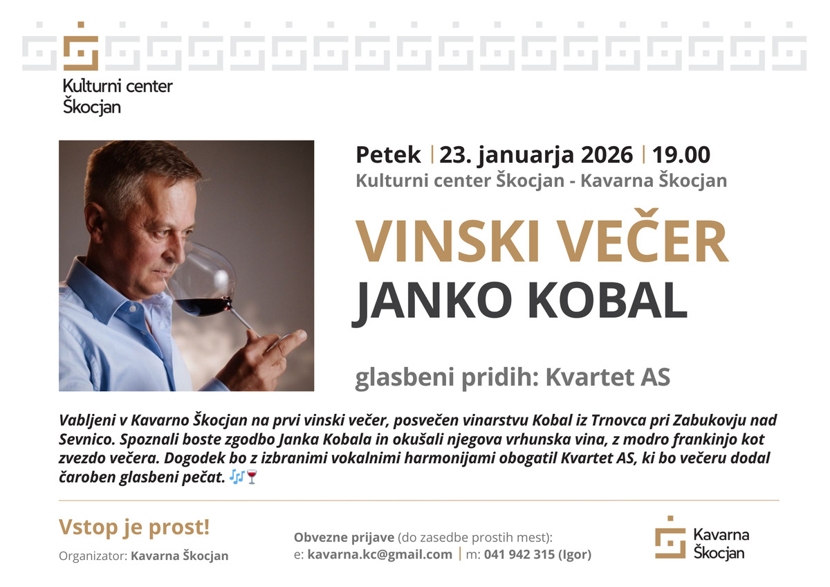 V Kavarni Škocjan odpiramo novo poglavje kulturnih in vinskih doživetij. V petek, 23. januarja 2026, ob 19. uri vas vabimo na prvi vinski večer, posvečen eni najlepših zgodb slovenskega vinogradništva – vinarstvu Kobal iz Trnovca pri Zabukovju nad Sevnico.