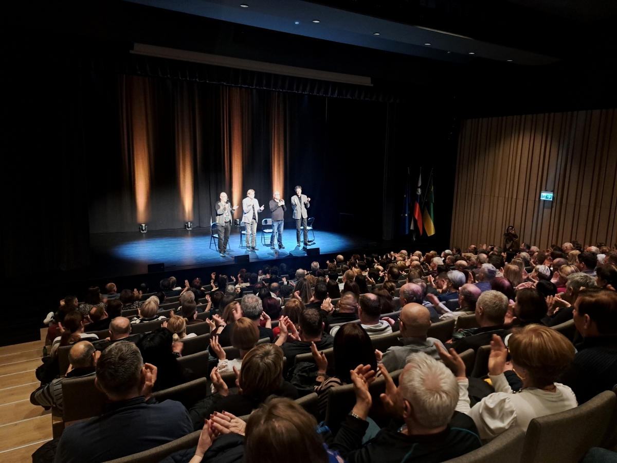 V dvorani je prevladoval smeh. Tisti pristni, trebušni. Občinstvo je ploskalo – ker so želeli, in ker so lahko. Na odru pa štirje mojstri, ki dokazujejo, da humor ne pozna rojstnega lista. Pozna le kilometrino.