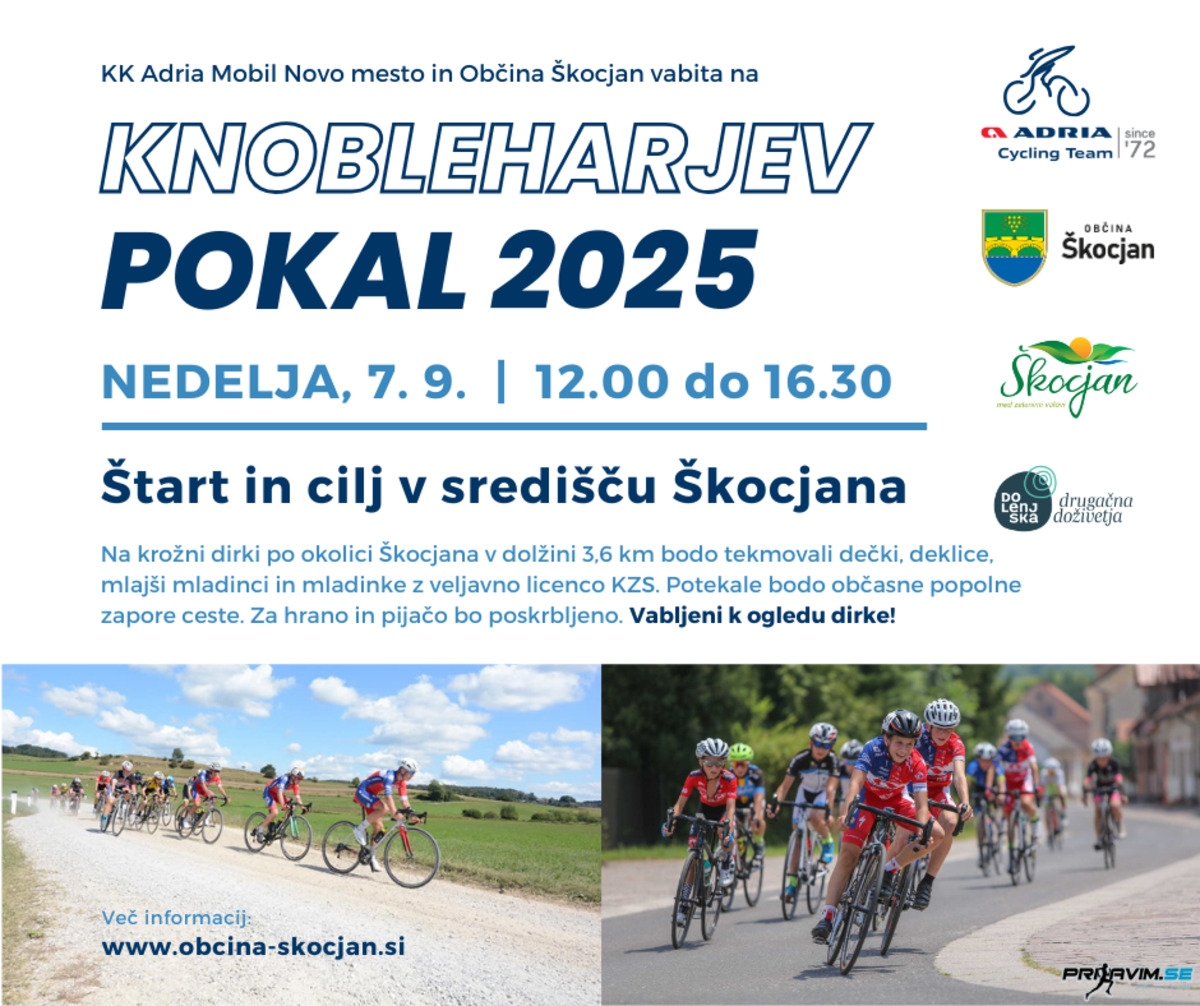 Občina Škocjan in Kolesarski klub Adria Mobil vas vabita, da se nam pridružite v nedeljo, 7. septembra 2025, na tradicionalni kolesarski dirki za Knobleharjev pokal.