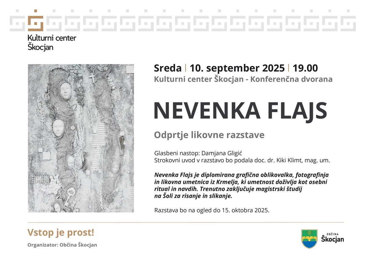 Kulturni center Škocjan vas vabi v sredo, 10. septembra 2025 ob 19. uri, v Konferenčno dvorano, kjer bo svoja dela predstavila Nevenka Flajs, diplomirana grafična oblikovalka, fotografinja in likovna umetnica iz Krmelja.