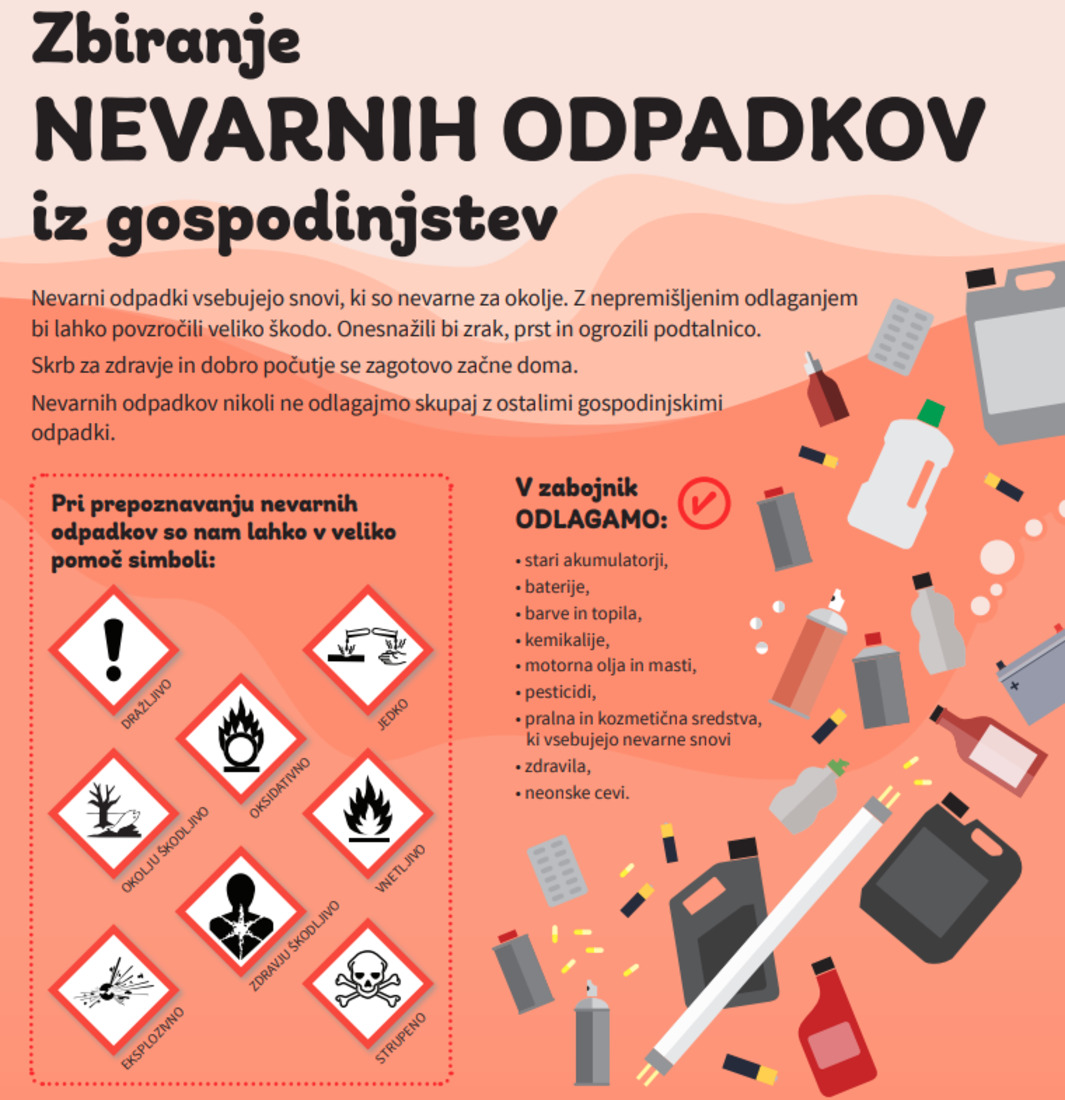 ⚠️ Najpogostejši nevarni odpadki iz gospodinjstev vključujejo: barve, laki, lepila, čistila, baterije, insekticide in druge kemikalije, ki lahko zaradi svojih nevarnih lastnosti ogrozijo zdravje ljudi ter poškodujejo okolje, če z njimi ne ravnamo pravilno.