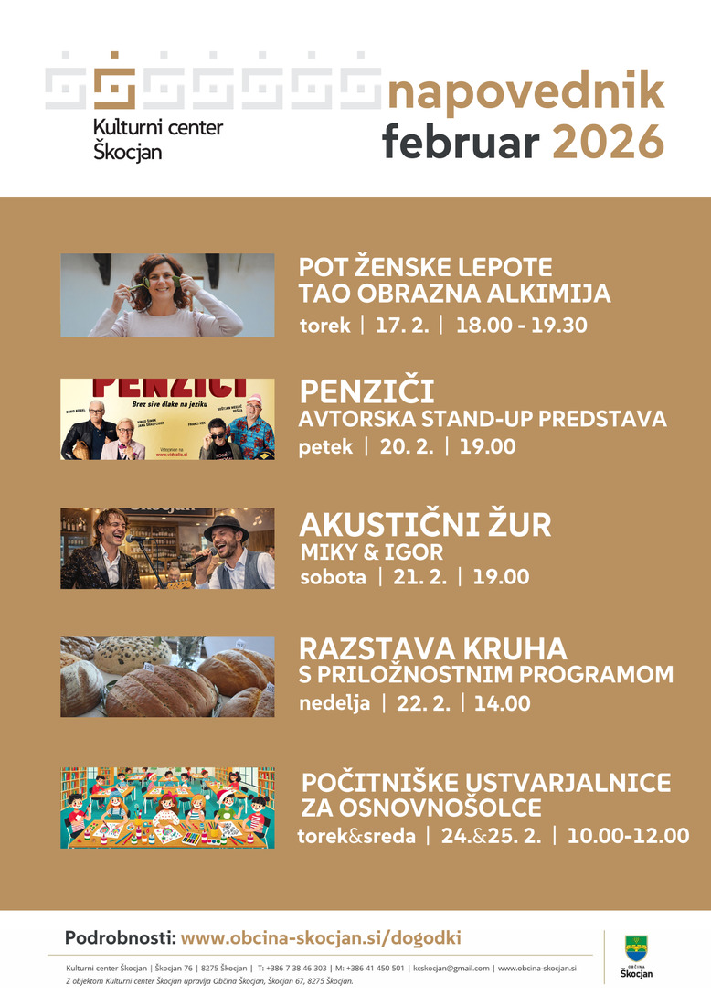Februar v Kulturnem centru Škocjan prinaša pester preplet kulture, glasbe, ustvarjalnosti, smeha in dogodkov za vse generacije. Od poklona slovenskemu kulturnemu prazniku, navdihujočih predavanj in potopisov, do otroških predstav, pustnega rajanja ter večerov za odrasle – vsak teden ponuja razlog, da se oglasite pri nas.